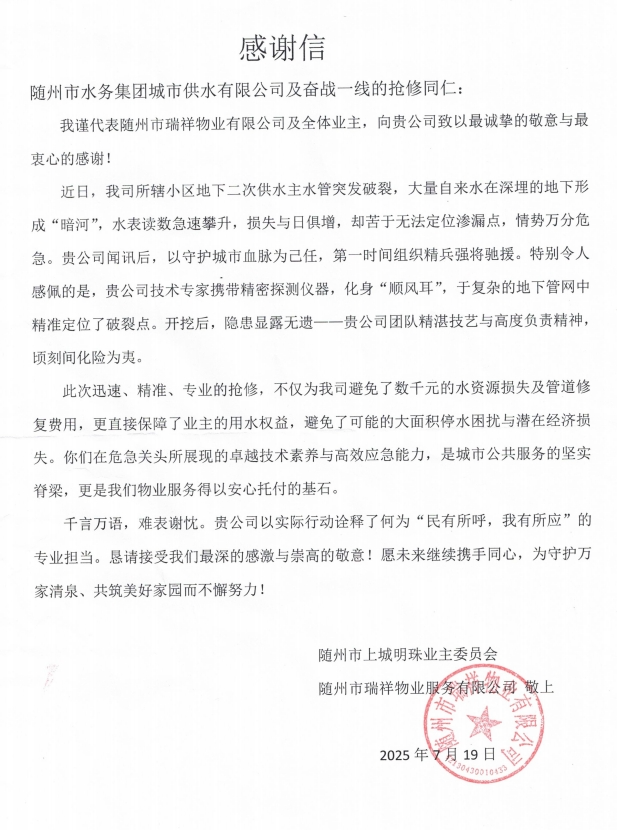此次精準(zhǔn)定位滲漏點(diǎn),只是城市供水公司保障城市供水安全、踐行為民服務(wù)宗旨的一個縮影。未來,城市供水公司將繼續(xù)以高度的責(zé)任感,專業(yè)嚴(yán)謹(jǐn)?shù)穆殬I(yè)擔(dān)當(dāng),在隨州大地上書寫更多水潤民生的溫暖答卷。