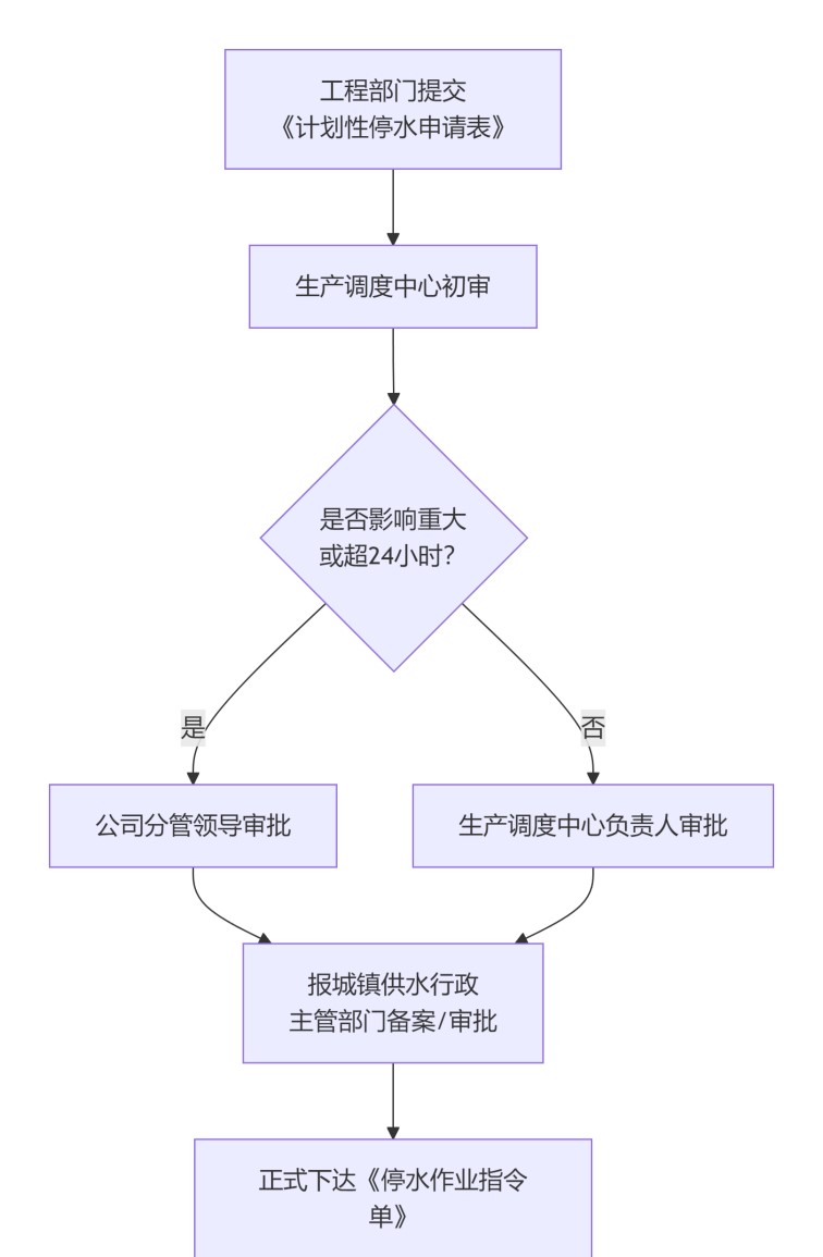 內(nèi)部審批:調(diào)度中心對停水的必要性、時(shí)長和范圍進(jìn)行初審。影響范圍廣或停水時(shí)間預(yù)計(jì)超過24小時(shí)的重大作業(yè),需報(bào)公司分管領(lǐng)導(dǎo)批準(zhǔn)。